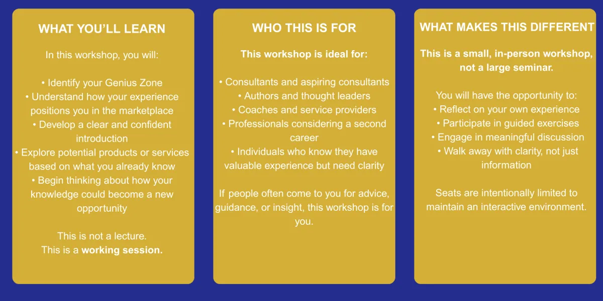 If you’ve been thinking about your next chapter, this workshop will help you take the first step with clarity and confidence.
